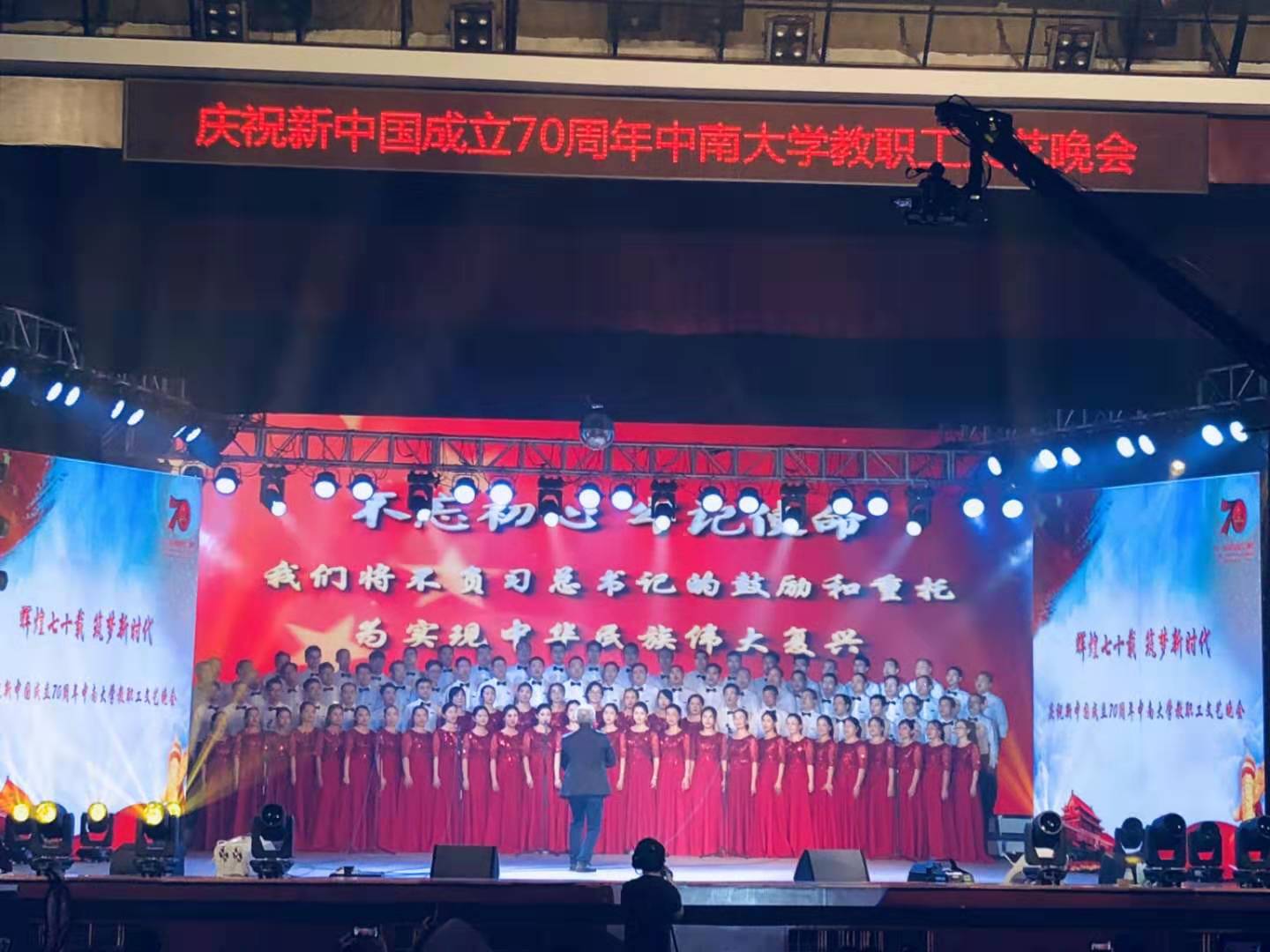 在27号晚上的bv伟德国际庆祝新中国成立70周年教职工文艺汇演上,公司参加合唱演出的老师们盛装登场,精神昂扬,指挥肖劲教授西装笔挺,全情投入,柴立元经理、成琼文书记全程为教职工们加油打气,“横断山,路难行,天如火来水似银”“亲人送水来解渴,军民鱼水一家人”“毛主席用兵真如神”……舞台上,公司老师们表现优异,将红军战士们的钢铁意志演绎得淋漓尽致,深深地打动了台下观看的师生,出彩的演出赢了现场观众热烈的掌声。节目结束后,公司收到了来自校工会常务副主席陈玉如的祝贺短信,高度赞扬肯定了公司合唱节目的出彩表现!据悉本次公司合唱节目是本次教职工文艺汇演所有节目参与人数最多、排练时间最长、彩排次数最多的节目,充分体现了公司教师团结一心,众志成城的良好氛围。