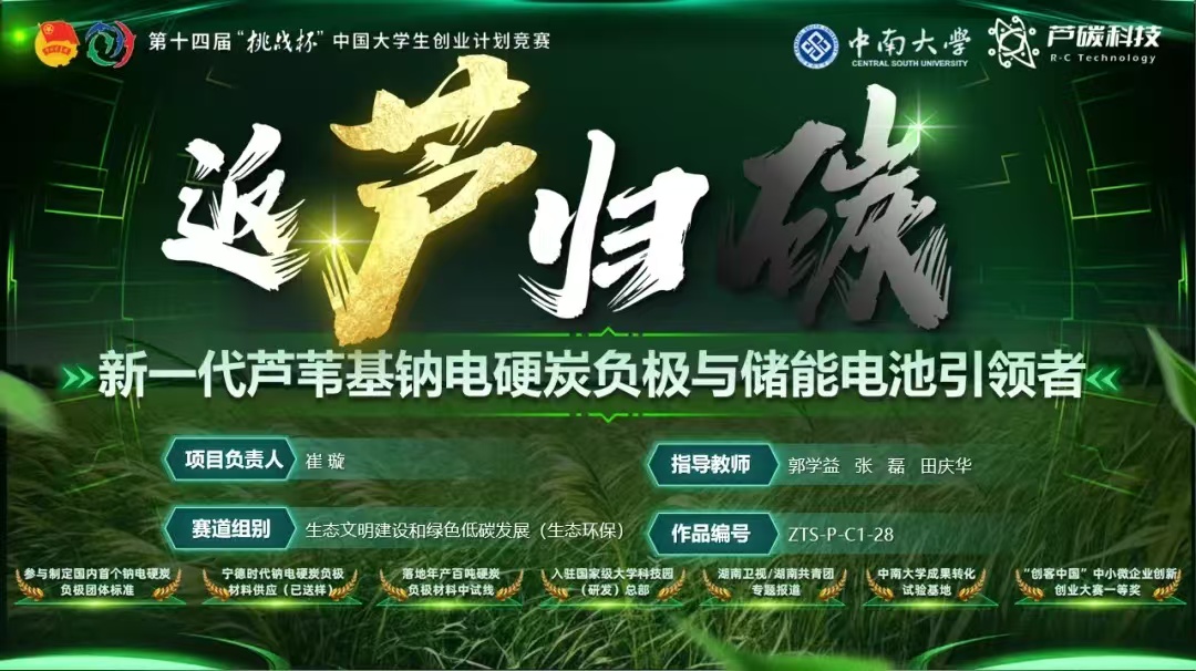 2024年11月2日,由共青团中央、教育部、人社部、中国科协、全国学联、陕西省人民政府共同主办的第十四届“挑战杯”中国老员工创业计划竞赛决赛在西安落下帷幕,其中,bv伟德国际1946崔璇等同学的创新项目《返“芦”归“碳”——新一代芦苇基钠电硬炭负极与储能电池引领者》,在众多参赛作品中脱颖而出,获湖南省本科院校唯一金奖。