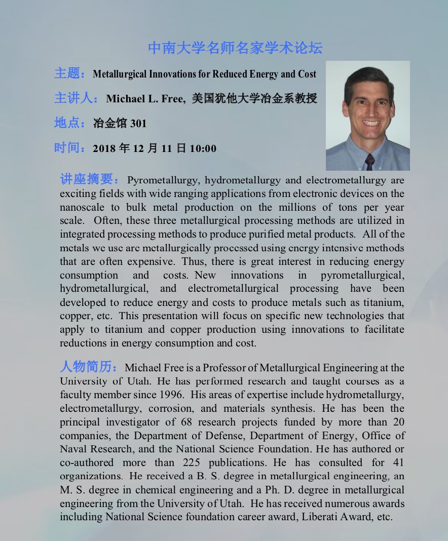 发布时间:2018-12-07 作者:Michael L. Free, 美国犹他大学冶金系教授 来源:bv伟德国际1946冶金馆301 浏览次数: