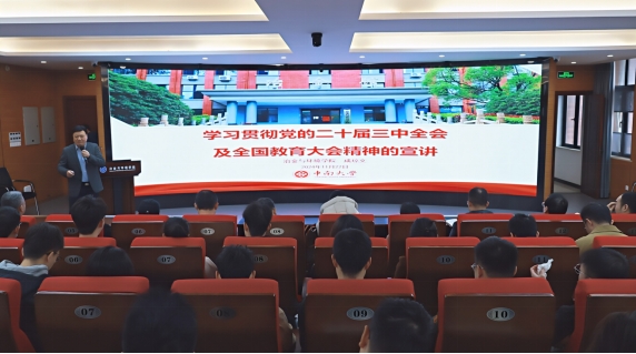 11月22日上午,公司党委书记成琼文在新校区金贵楼520报告厅讲授学习贯彻党的二十届三中全会精神及全国教育大会精神专题党课。公司各党支部书记、支委及综合教工党支部、冶化所研究生第一党支部、冶化所研究生第二党支部、本科生环境能器党支部全体党员120余人参加学习。